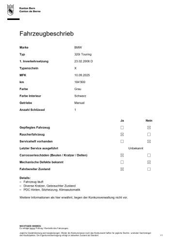 Jegliche Gewährleistung wird wegbedungen. Weder die Konkursmasse noch das Konkursamt haften für Rechts- und/oder Sachmängel des Kaufobjektes. Die Eigentumsübertragung erfolgt im aktuellen Zustand ab Standort.