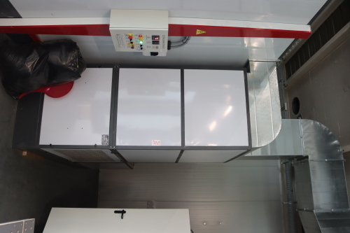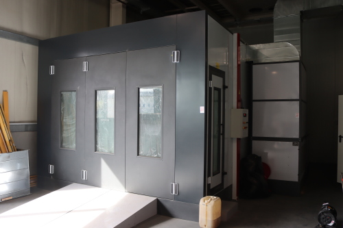 Lander Farbspritzkabine, Abmessung Innen ca. 690 x 390 x 256cm, Abmessung Aussen Kabine ca.720 x 420 x 330cm, Platzbedarf ca. 10 x 60 x 6m mit Absaug-/ Filtervorrichtung